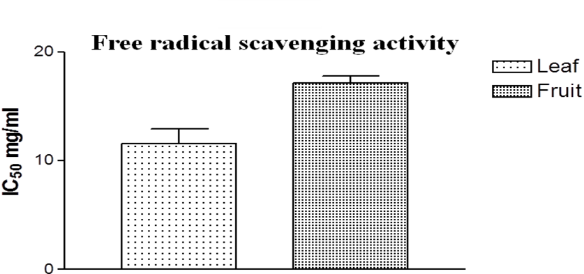 Fig.2:Free radical scavenging activity of leaf and fruit extracts of AC plant. Values are mean±SD (n=3)