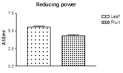 The reducing capacity of a compound may serve as a significant indicator of its potential antioxidant activity [49]. Reducing power assay measure the electron donating capacity of an antioxidant. The reduction of ferric ion to ferrous ion is measured by the intensity of resultant blue-green solution which absorbs at 700 nm and an increased absorbance is indicative of higher RP. Our result showed that leaf extract showed better reducing power than fruit extract.