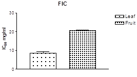 FIC activity in ethanolic leaf and fruit extracts are shown in fig. 3. FIC activity of leaf and fruit extract in terms of IC50 was found to be 8.56 and 20.63 mg/ml, respectively. It was clear that leaf extract of AC showed maximum ferrous ion chelation activity. Fe2+ increased the formation of hydroxyl radicals through the Fenton reaction, which is responsible for the occurrence of many diseases [30].