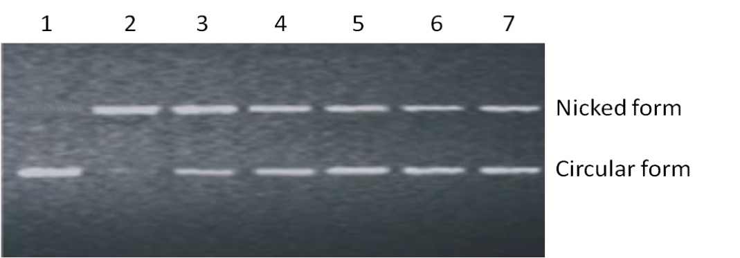 Fig.5: Agrarose gel electophoretic pattern showing concentration dependent protective effect of AC leaf extract on supercoiled DNA, damage caused by Fenton’s reagent. Lane 1: pBR322 DNA; Lane 2: DNA+Fenton; Lane 3, 4, 5, 6, 7: DNA+Fenton+Plant extract (0.5, 1.0, 1.5, 2.0 and 2.5 mg/ml)