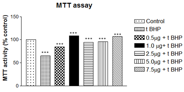 Fig.6: Cytotoxic potential of t-BHP as well as the protective activity of ethanolic extract of AC leaf. Cells treated with t-BHP alone were compared to control cells, whereas cells treated with plant extracts followed by t-BHP were compared to cells treated with t-BHP alone. Values are mean±SD (n=3).***P<0.001