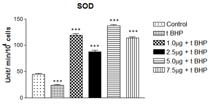 Fig.7: Effect of ethanolic AC leaf extract on SOD activity against t-BHP induced stress in primary rat hepatocytes. Cells treated with t-BHP alone were compared to control cells, whereas cells treated with plant extracts followed by t-BHP were compared to cells treated with t-BHP alone. Values are mean±SD (n=3).***P<0.001