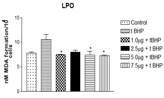 Oxidative stress induced in the hepatocytes due to 250µM of t-BHP, produces 10.57 nM MDA/1x104cells. Treatment of hepatocytes cells with AC leaf extract at concentrations of 1.0, 2.5, 5.0 and 7.5 µg against t-BHP induced oxidative stress and produced 7.47 nM (P<0.05), 8.02nM, 7.38 nM (P<0.05) and 7.28 nM (P<0.05) MDA/1x104cells, respectively [fig. 8]. Results showed that there was a significant reduction in MDA formation in leaf extract treated cells. AC leaf has maximum anti-lipid peroxidation activity at a concentration of 7.5µg.