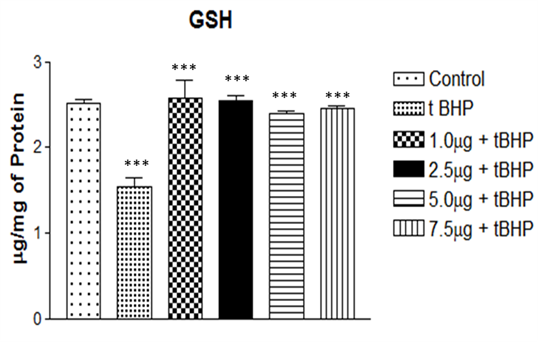 In the current study, we found that 1h treatment with t-BHP caused reactive oxygen species (ROS) production which decreases GSH content. Cultured hepatocytes, when subjected to 250µM of t-BHP treatment, showed 1.54µg GSH/mg of protein (P<0.001) which is 1.63 folds less than the untreated cells. Treatment of hepatocytes cells with AC leaf extract at concentrations of 1.0, 2.5, 5.0 and 7.5 µg against t-BHP induced oxidative stress protect the GSH depletion up to 1.66, 1.65, 1.55 and 1.59 fold, respectively as compared to t-BHP [fig. 9]. The results reflect that treatment of hepatocytes cells with AC leaf extracts efficiently blocked t-BHP-induced GSH depletion at a concentration of 1.0 µg.