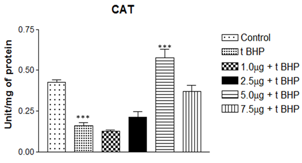 Catalase is an essential cytosolic antioxidant enzyme which converts H2O2 to H2O (56). The extracts showed the enhanced activity of enzyme CAT ensuring better antioxidant and protective effect on the stimulated cells against the deleterious effects of the t-BHP and generation of other radicals.