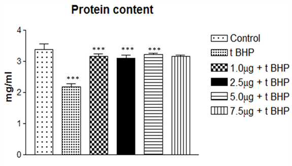 Fig.12: Effect of AC leaf extract on total protein content against t-BHP induced stress in primary rat hepatocytes. Cells treated with t-BHP alone were compared to control cells, whereas cells treated with plant extracts followed by t-BHP were compared to cells treated with t-BHP alone. Values are mean±SD (n=3).***P<0.001