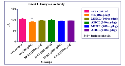 Fig. 1: Effect of MHCL, AHCL and indomethacin on SGOT level [mean±SEM, n= 6] significant ** p<0.01 when compared with control