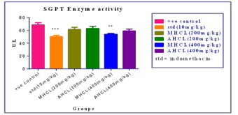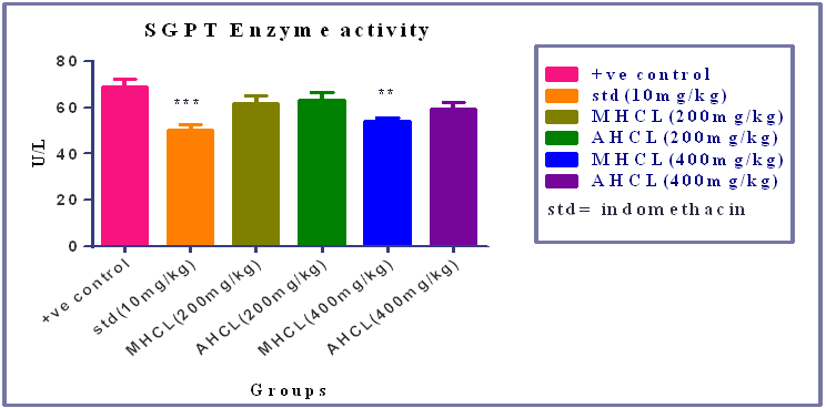 Fig. 2: Effect of MHCL, AHCL and indomethacin on SGPT level [mean±SEM, n= 6] significant ** p<0.01, *** p<0.001 when compared with control