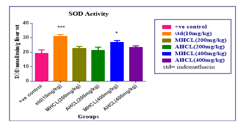 Fig. 5: SOD Assay of MHCL, AHCL and Indomethacin [mean±SEM, n= 6] significant * p<0.05, *** p<0.001 when compared with control