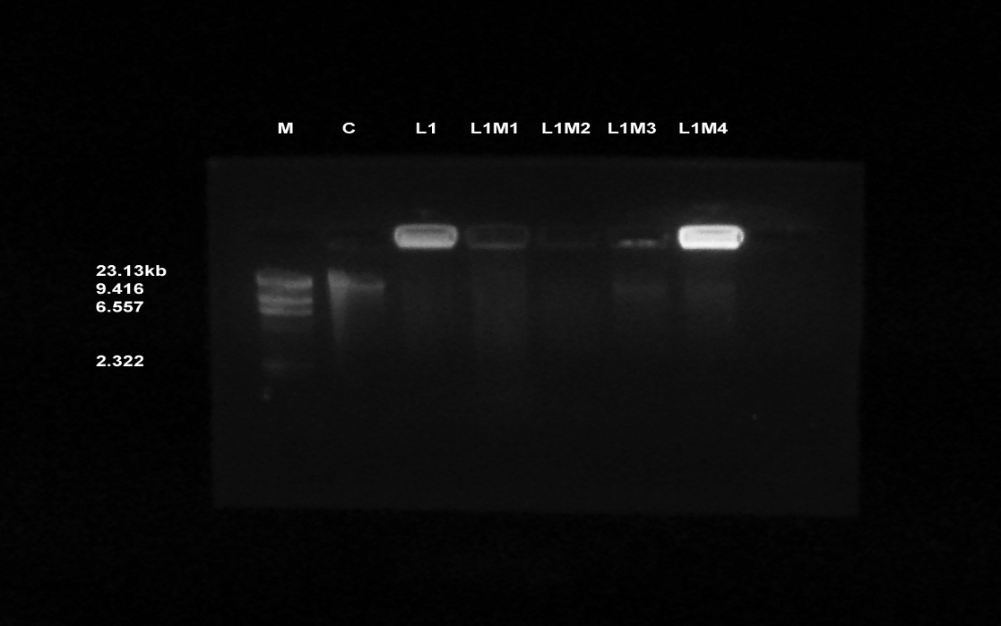 Fig.4: DNA cleavage: M: Standard DNA, C: Control DNA (untreated pBR 322), L1: Ligand (L), L1M1: Cu (II) complex, L1M2: Co (II) complex, LIM3: Ni (II) complex and L1M4: Zn (II) complex