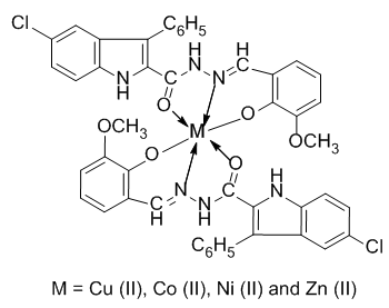 To the hot solution of 5-chloro-N'-(2-hydroxy-3-methoxy-benzylidene)-3-phenyl-1H-indole-2-carbohydrazide (0.002 mol) in ethanol (30 ml) was added a hot ethanolic solution (15 ml) of respective metal chlorides (0.002 mol). The reaction mixture was refluxed on a water bath for about 5 h. Sodium acetate (0.5 g) was added to the reaction mixture to maintain a neutral pH and to reflux was continued for 1 h more. The reaction mixture was poured into distilled water. The solid colored complexes separated were collected by filtration, washed with sufficient quantity of distilled water, then with hot ethanol to apparent dryness and dried in a vacuum over anhydrous calcium chloride in a desiccator.