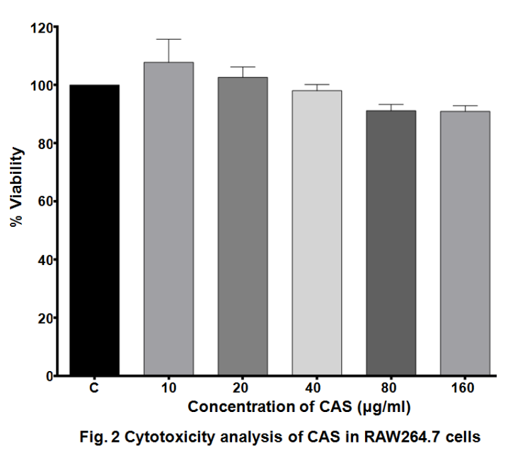 The cells exhibited around 91% viability in response to CAS up to a higher dose of 160 µg/ml (fig. 2).