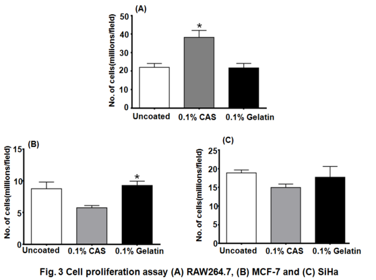 Interestingly, in the proliferation assay, we found that compared to either uncoated or gelatin coated wells, CAS treated wells increased the proliferation of RAW264.7 cells significantly (fig. 3A). However, upon coating of cancerous cell lines, MCF-7 (fig. 3B) and SiHa (fig. 3C), on CAS coated wells, they showed a slight decrease in proliferation, compared to either uncoated or gelatin coated wells.