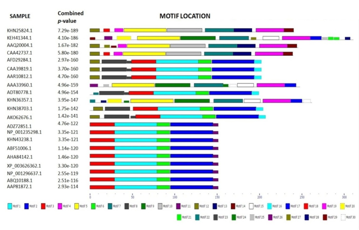 For motif searching Multiple Expectation-Maximization for Motif Elicitation (MEME) suite tool was implemented [11]. Thirty different motifs were detected and distributed by MEME software. The motifs were found to be shared in the different pattern by 3 types of SODs of analysed plants (fig. 5). Motifs 1, 2, 3 and 6 were found to be conserved in CuZnSOD as they are shared by all the CuZnSODs in the almost similar pattern. Motifs 4, 5 and 7 were found to be conserved in the FeSOD and MnSOD and further, it was observed that these two SODs have a different set of conserved motif individually, motifs 10, 13, 14 and 19 were found to be conserved in MnSOD and motifs 9, 15 and 28 was conserved in FeSOD (fig. 5).