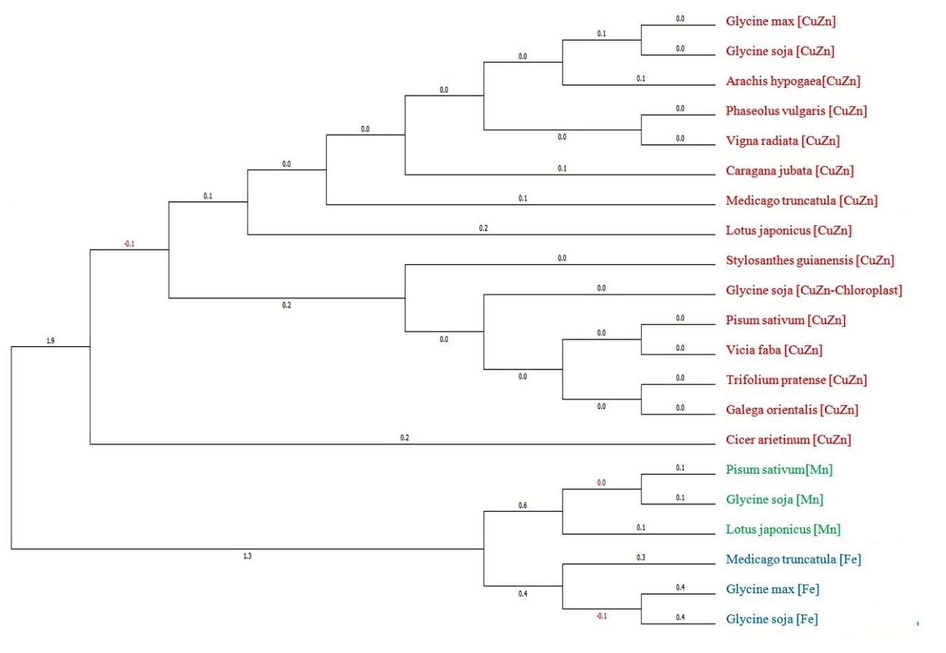 Fig. 6: Phylogenetic tree of different SOD types in selected fabaceae plants