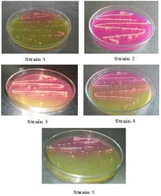 Forty bacterial isolates obtained as pure cultures were examined for L-asparaginase production using modified M9 medium. In the modified M9 plate media, only five strains showed the ability of the production of L-asparaginase, and this was based on the colour change due to change in pH of the medium (Plate 1). Asparaginase causes the hydrolysis of L-asparaginase into L-aspartic acid and ammonia. The release of ammonia changes pH due to phenol red indicator; it has a pale yellow color with the acidic condition, as the pH changes to alkaline it turns to pink.