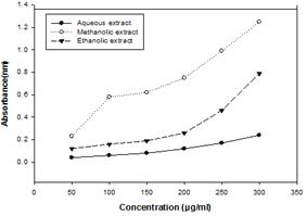 The reducing potential capacity of the plant extracts increased as per their concentration in all the three solvents. The methanolic extract showed maximum reducing power followed by ethanolic extract and the minimum was found in aqueous extract. Increased absorbance of the reaction mixture indicated an increase in reducing power capacity (fig. 1).