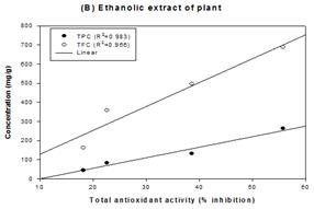 The correlation coefficient (R2) between antioxidant activity and reducing potential was found (R2=0.849), (R2=0.962) and (R2=0.963) for methanolic, ethanolic and aqueous extract respectively (fig. 3A-C).