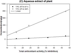 Fig. 2: Correlation between antioxidant activity and polyphenols (TPC and TFC) of E. prostrata (A) Methanolic extract of plant (B) Ethanolic extract of plant and (C) Aqueous extract of plant