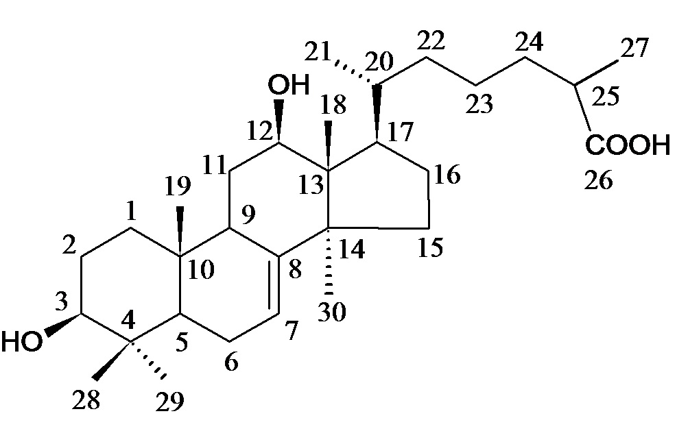Elution of the column with petroleum ether-chloroform (1:3) mixture yielded colourless crystals of 3, recrystallized from acetone, 732 mg (0.048% yield); Rf: 0.48 (chloroform: methanol: 4:1); m. p.: 218-220 °C; UV λmax (MeOH): 212, 277 nm (log ε 5.3, 2.8); IR νmax (KBr): 3419, 3315, 2932, 2855, 1694, 1640, 989 cm-1; 1H NMR (DMSO-d6): δ 5.13 (1H, m, H-7), 3.78 (1H, dd, J = 5.1, 9.5 Hz, H-3α), 3.89 (1H, dd, J = 5.2, 9.3 Hz, H-12α), 1.22 (3H, brs, Me-28), 1.20 (3H, brs, Me-29), 1.16 (3H, d, J = 6.5 Hz, Me-21), 1.12 (3H, brs, Me-30), 1.04 (3H, brs, Me-19), 0.98 (3H, d, J = 6.0 Hz, Me27), 0.83 (3H, brs, Me-18); 13C NMR (DMSO-d6) (table 1); FAB MS m/z (rel. int.): 475 [M+H]+(C30H51O4) (2.3).