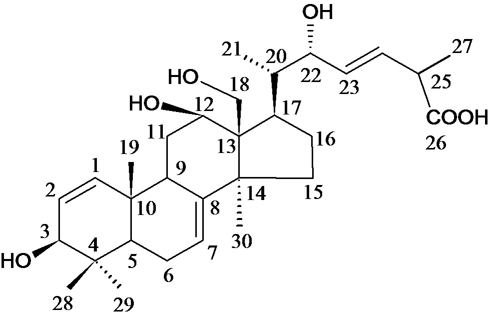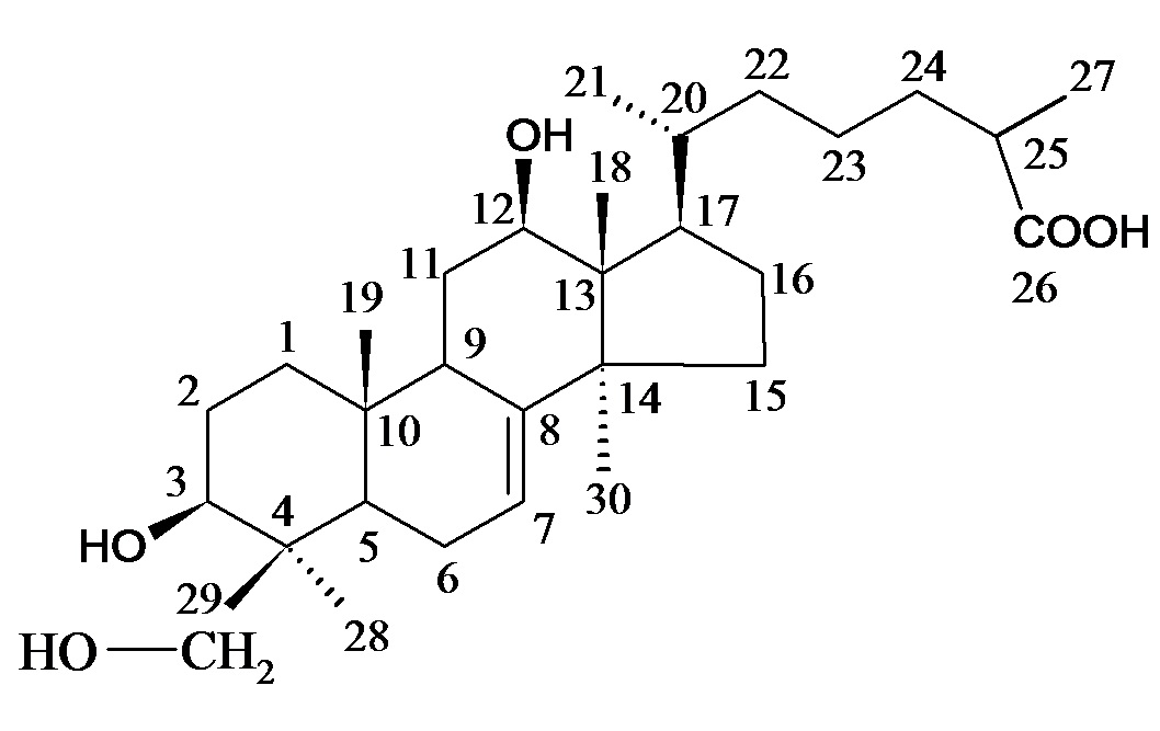 Elution of the column with chloroform mixture afforded colorless crystals of 4, recrystallized from acetone, 564 mg (0.037% yield); Rf: 0.64 (chloroform: methanol; 4:1); m. p.: 222-225 °C; UV λmax (MeOH): 210, 281 nm (log ε 5.3, 1.1); IR νmax (KBr): 3423, 3381, 3275, 2925, 1690, 1630, 956 cm-1; 1H NMR (DMSO-d6): δ 5.13 (1H, m, H-7), 3.75 (1H, dd, J = 5.2, 9.3 Hz, H-3α), 3.86 (1H, dd, J = 5.3, 9.1 Hz, H-12α), 3.40 (1H, brs, HOCH2-29a), 3.38 (1H, brs, HOCH2-29b), 1.15 (6H, brs, Me-28, Me-30), 1.04 (3H, brs, Me-19), 0.99 (3H, d, J = 6.6 Hz, Me-21), 0.91 (3H, d, J = 6.1 Hz, Me27), 0.87 (3H, brs, Me-18); 13C NMR (DMSO-d6) (table 1);+ve FAB MS m/z (rel. int.): 490 [M]+(C30H50O5) (2.6).