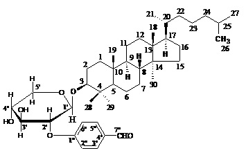 Elution of the column with chloroform-methanol (9:1) mixture furnished pale yellow crystals of 7, recrystallized from methanol, 210 mg (0.014% yield); Rf: 0.64 (toluene: ethyl acetate: formic acid; 5:4:1); m. p.: 58-59 °C; UV λmax (MeOH): 212, 278 nm (log ε 4.9, 4.6); IR νmax (KBr): 3441, 3386, 2921, 2837, 1703, 1644, 950, 888 cm-1; 1H NMR (DMSO-d6): δ 3.81 (1H, dd, J = 5.5, 9.0 Hz, H-3α), 1.27 (3H, brs, Me-29), 1.25 (3H, brs, Me-28), 1.20 (3H, d, J = 6.3 Hz, Me-21), 1.16 (3H, brs, Me-30), 1.05 (3H, brs, Me-19), 0.98 (3H, d, J = 6.2 Hz, Me-27), 0.96 (3H, d, J = 6.1 Hz, Me-26), 0.89 (3H, brs, Me-18), 5.09 (1H, d, J = 7.5 Hz, H-1'), 4.84 (1H, dd, J = 7.5, 6.3 Hz, H-2'), 4.71 (1H, m, H-3'), 3.96 (1H, m, H-4'), 3.71 (2H, d, J = 6.5 Hz, H2-5'), 7.23 (2H, m, H-2'', H-6''), 7.18 (2H, m, H-3'', H-5''), 10.6 (1H, brs, H-7''); 13C NMR (DMSO-d6) (table 1);+ve FAB MS m/z (rel. int.): 667 [M+H]+(C42H67O6) (1.1), 429 (C30H53O) (15.3).