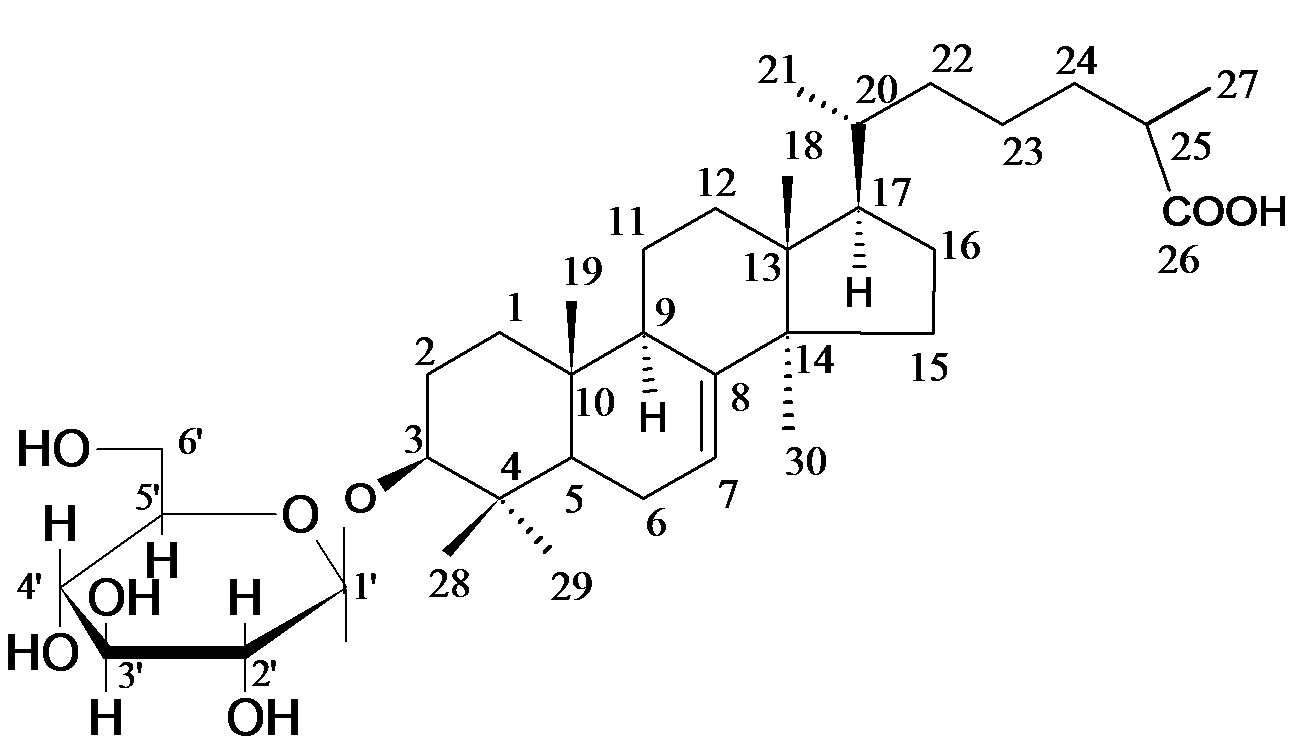 Further elution of the column with chloroform-methanol (9:1) mixture gave colourless crystals of 8, recrystallized from methanol, 586 mg (0.037% yield); Rf: 0.86 (chloroform: methanol; 4:1); m. p.: 179-180 °C; UV λmax (MeOH): 214, 248 nm (log ε 5.3, 4.6); IR νmax (KBr): 3410, 3389, 3250, 2924, 1692, 1650, 808 cm-1; 1H NMR (DMSO-d6): δ 5.28 (1H, d, J = 5.3 Hz, H-7), 3.72 (1H, dd, 5.2, 9.1 Hz, H-3α), 1.28 (3H, brs, Me-28), 1.19 (3H, brs, Me-29), 1.15 (3H, brs, Me-30), 1.06 (3H, brs, Me-19), 1.01 (3H, d, J = 6.3 Hz, Me-21), 0.95 (3H, d, J = 6.2 Hz, Me27), 0.83 (3H, brs, Me-18), 5.08 (1H, d, J = 7.1 Hz, H-1ʹ), 4.17 (1H, dd, J = 6.9, 7.1 Hz, H-2ʹ), 3.79 (1H, m, H-3ʹ), 3.51 (1H, m, H-4ʹ), 4.63 (1H, m, H-5ʹ), 3.10 (1H, t, J = 6.9 Hz, H2-6'a), 3.07 (1H, t, J = 6.9 Hz, H2-6'b); 13C NMR (DMSO-d6) (table 1);+ve FAB MS m/z (rel. int.): 621 [M+1]+(C36H61O8) (3.1), 440 (7.3), 395 (26.5).