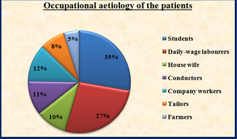 Among all the cases, infections at various sites in the body including the scalp, groin, thighs, face, hands, nails, full body, hips and check, the maximum infection were recovered from groin followed by skin, check and hand. In the occupational status of the patients, students were highly susceptible to the skin infection followed by daily-wage laborers, housewife, drivers and conductors, company workers and tailors. The least common group infected was retired persons and farmers (fig. 2).