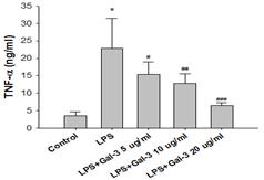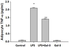 Fig. 2: Adipocytes treated with LPS (1µg/ml), LPS+galectin-3 (20µg/ml), galectin-3. n = 6 for all groups and the release of TNF-a release in the culture medium is analyzed. *p<0.05 in relation to control, **p<0.05 in relation to LPS