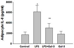 Fig. 3: Adipocytes treated with LPS (1µg/ml), LPS+galectin-3 (20µg/ml), galectin-3. n = 6 for all groups and the release of IL-8 in the culture medium is analyzed. *p<0.05 in relation to control, **p<0.05 in relation to LPS
