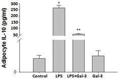 Fig. 4: Adipocytes treated with LPS (1µg/ml), LPS+galectin-3 (20µg/ml), galectin-3. n = 6 for all groups and the release of IL-10 in the culture medium is analyzed. *p<0.05 in relation to control, **p<0.05 in relation to LPS