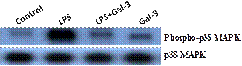 Fig. 8: Galectin-3 significantly attenuates p38 MAPK phosphorylation induced by LPS in adipocytes. Proteins (50 µg per lane) were separated by SDS-PAGE and analyzed by Western blotting using an anti-phospho-p38 MAP Kinase protein antibody (Thr180/Tyr182). Loading equality was controlled using an antibody against the unphosphorylated isoform of p38. The data represent a typical result from three independent experiments