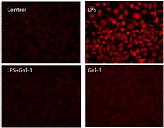 Fig. 9: Detection of superoxide production in macrophages by microscopy using Di hydroethidium (DHE) dye. Macrophage cells were treated or not for 30 min with 1µg/ml LPS together with or without 20 µg/ml galectin-3, stained with 10 µg/ml DHE and then assayed by fluorescent microscopy