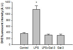 RAW 264.7 cells with 0.5 mg/ml zymosan is added to stimulate oxidative burst and suspended in six-well plates, and experiments were carried out for the cells. After serum starvation (1% FBS) for 16h, macrophages were treated with LPS (1µg/ml) and/or galectin-3 (20µg/ml) in 2 mL DMEM containing 1% FBS and 1% penicillin/streptomycin) for additional 24 hours. During the last 10 min of treatment, cells were incubated with 10 µM DHE and kept in an incubator at 37 °C with 5% CO2/95% air. Cells were visualized under an inverted fluorescent microscope (Leica) with an excitation filter of 535±25 nm and an emission filter of 610±25 nm. The images were acquired for an average of 1s using a spot digital camera and software [22].