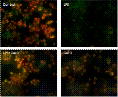 Fig. 11: Detection of mitochondrial membrane potential by microscopy using JC-1 dye: RAW 264.7 cells were treated or not for 30 min with 1 µg/ml LPS together with or without 20 µg/ml. Galectin-3, stained with JC-1 and then assayed by fluorescent microscopy. Fluorescence emission shift from red (˜590 nm) to green (˜529 nm), representing mitochondrial membrane depolarization, was monitored at 488 nm excitation. Representative images acquired 30 min after the LPS challenge, are presented. Green and red fluorescent images were taken of the same microscopic field and merged images of three independent experiments are presented