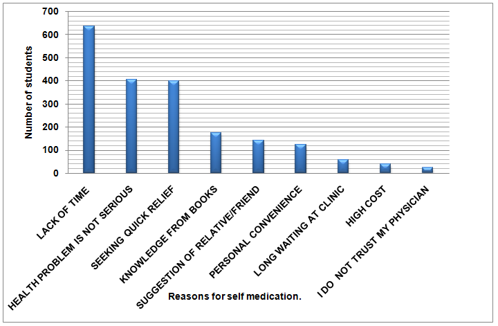 In our study students were reported that the lack of time, minor health problems and seeking for quick relief are the major reasons for taking drugs without a prescription. 23.64% students were reported that they have knowledge about the disease and drugs from books. 19.29% students took medication by accepting the suggestion from friends and relatives, 16.57% used it for their personal convenience. 7.88% were used this medication to avoid the long waiting at clinics, 5.43% of students reported that they were used the self-medication due to the high cost of medical consultation, and finally 3.1% were do not trust their physician.
