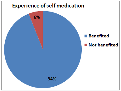 among 736 students 695 (94%) were believed to be benefited from self-medications and the other 41 (6%) were experienced that the self-medication is not benefited to them
