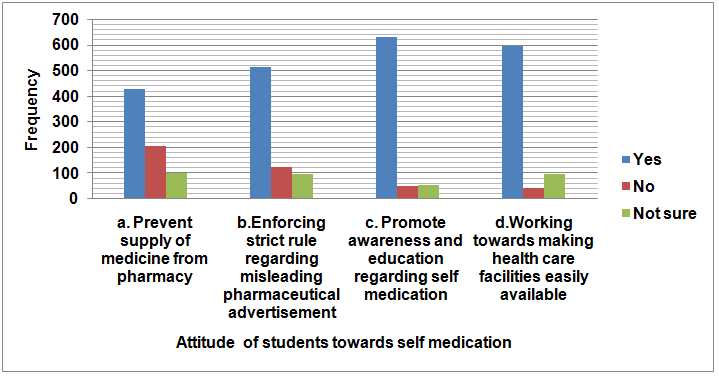 For reducing the growing trend of self-medication, most of the students suggested that ‘promote the awareness and education regarding self-medication’ were very important. Other participants told ‘working towards making health care facilities easily available’ as a second most strategy to reduce self-medication. Followed by students whom perceives to enforce strict rule regarding misleading pharmaceutical advertisement and less students were supporting to prevent supply of medicine from pharmacy (fig. 3)