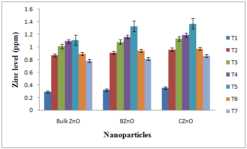 Fig. 2: Zinc level in different concentration of zinc oxide nanoparticles treated Sesamum indicum leaves. Data represent as mean±SE
