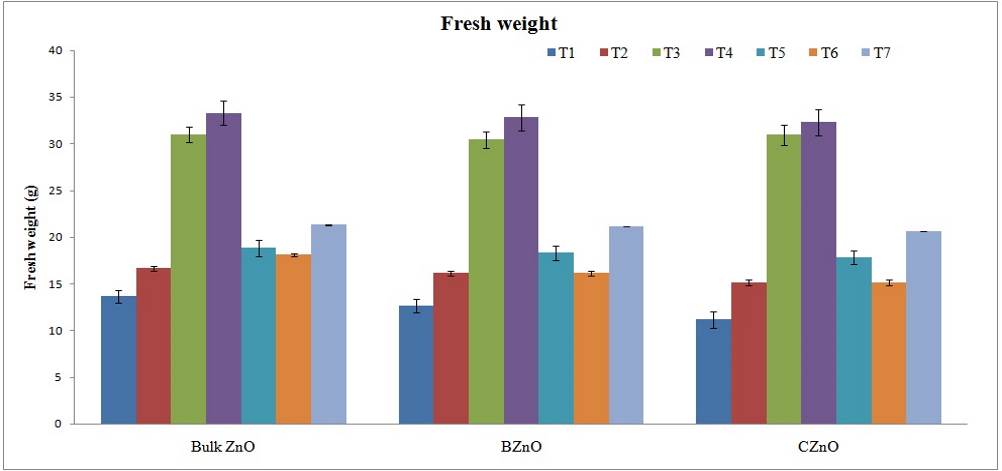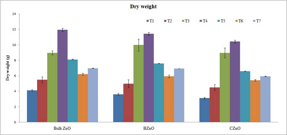 Manivasagaperumal et al. [22] confirmed a gradual decline in the dry matter production of the plant sample at higher concentration. This result indicated that application of ZnO slightly increased dry and fresh weight at a lower concentration while an excess of ZnO nanoparticles reduced the biomass [23].