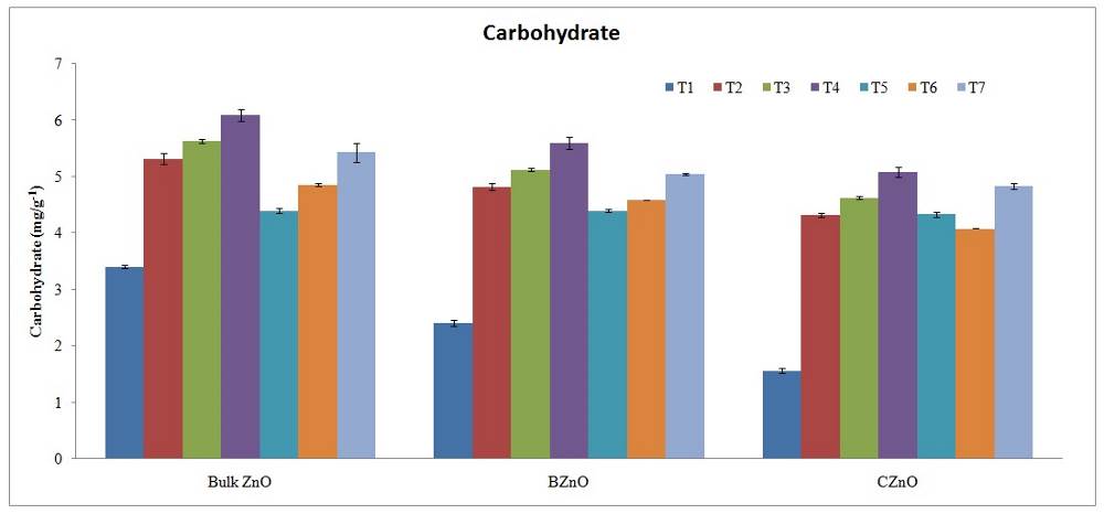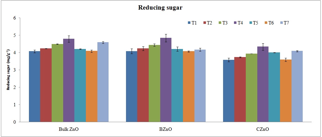 Photosynthesis pigment content was significantly (p<0.05) increased by BZnO in sesamum at a concentration of 0.5 g/l (T4 treatment). A similar trend of a drop in the chlorophyll level was noticed in the plant samples treated with increased concentration (1 and 2 g/l) of green and chemical NPs. The decline within the overall chlorophyll contents, as well as the growth inhibited, can be regarded as general responses associated with metal toxicity. Mukherjee et al. [24] observed lower in chlorophyll level in leaves, compared to control plant treated with ZnO NPS or bulk ZnO in organic matter enriched the soil. Salama [25] proved the effect of AgNPs on the carbohydrate content of common bean (Phaseolus vulgaris) and corn (Zea mays) plant at higher doses which may be attributed to a toxic level of nanoparticles causing a subsequent decline in growth.