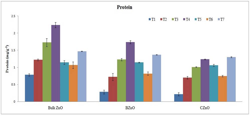 Farshian et al. [19] showed a reduction in the protein total content of lettuce plant, which might be caused by the toxic effect of chemically synthesized ZnO nanoparticles on the protein synthesis. Protein concentration decreased in Brassica juncea seedlings due to metal treatment, particularly at the highest Zn concentration [26]. Protein and sugar were significantly reduced in this cereal wheat (T. aestivum) as reported by Tandon and Gupta [27] at increased doses of heavy metal. Qiang et al. [28] reported decreased in the sugar soluble content of wheat on the application of slow release fertilizer coated and felted by nanomaterials. The same result was obtained by Liu et al. [29] who demonstrated that low concentration of nano calcium carbonate caused increasing soluble sugar and peanut protein. From the phytotoxicity above studies prove that chemically synthesized nanoparticles are more toxic to the plant environment when compared green synthesis.