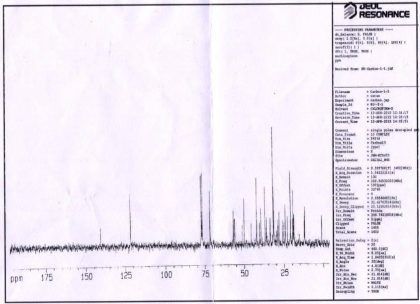 The compound is a white needle-shaped crystal with melting point 138-140 °C which gave positive Salkowski and Lieberman-Burchard test for the steroid. Based on its spectral data (fig. 1, fig. 2) and physical properties, the compound was identified as the known compound β-sitosterol, and its structure is given in fig. 3.