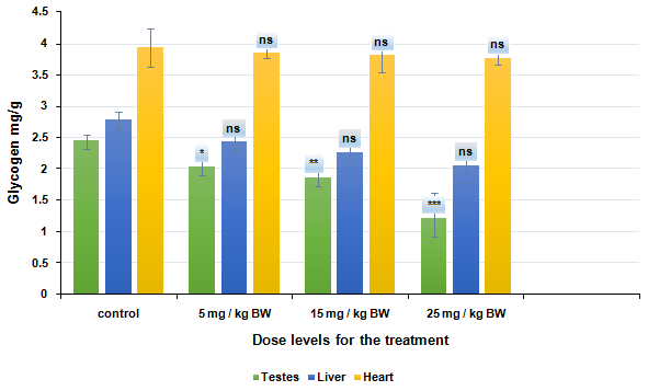 This led to the depletion of the nutritional requirements of sperms. Significant depletion in glycogen content of the testes by BS treatment is possibly due to the inhibition of phosphorylase inactivation or the depletion of certain other enzymes which are required for glycogenesis. Sertoli cells and spermatogonia contain Glycogen and provide nourishments to the seminiferous tubular cells and the Glycogen content is found to be directly proportional to the steroid hormone levels. A decrease in glycogen content of the Testes reduced the energy source for spermatogenic activity, which might have resulted in the spermatogenic arrest. Ascorbic acid prevents DNA damage induced by scavenging the ROS generated in testes [57]. Decreased Ascorbic acid content represents the hypo-functioning of the Testes and the degeneration of the germinal epithelium due to vitamin C deficiency.