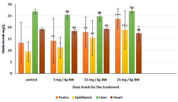 Thejashwini et al. [47] in their study, which was conducted on cyamposis psoralioides in male swiss albino mice concluded that testosterone is an important steroidal androgen, plays a central role in maturation, spermatogenesis and the maintenance of accessory sex organs and Testes. Like other steroid hormones, testosterone is also a derivative of cholesterol, which is in the agreement with previous studies [48]. β-sitosterol is a primary steroid used in traditional medicine, which is structurally similar to cholesterol. So, β-sitosterol may inhibit the conversion of cholesterol to testosterone by blocking the side chain cleavage of cholesterol by CYP11A(a mitochondrial cytochrome P450 oxidase) or any other step of testosterone biosynthesis. Therefore, any small change in testosterone content may result in the reduction of reproductive organs weight.