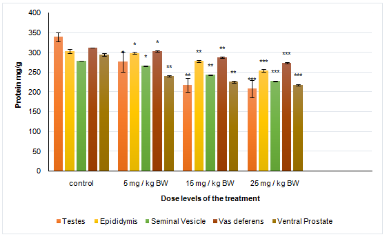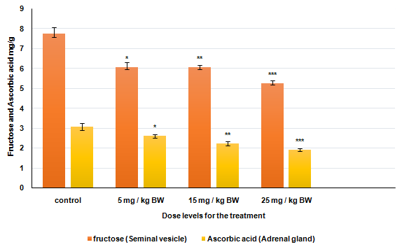 Results: Average weight of reproductive organs, serum levels of Testosterone, Follicular stimulating hormone (FSH) and Luteinizing hormone (LH), levels of Protein, Ascorbic acid, Glycogen, Fructose, sperm motility and sperm density was decreased significantly as compared to control group. While, Cholesterol level was increased significantly. Fertility percentage was also decreased in treated groups. Body weight remained unchanged.