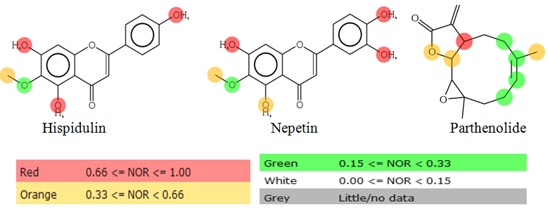 The color highlighting an atom indicates its Normalized Occurrence Ratio (NOR). A high NOR indicates a more frequently reported site of metabolism in the metabolite database. Atoms are colored according to the likelihood of a metabolic site; High: red, Medium: orange, Low: green, very low is not colored, and No data: grey.PASS online server
