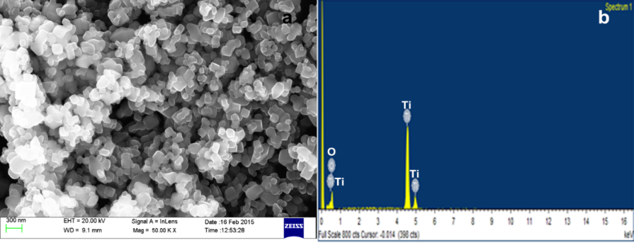 The synthesized nanoparticles were subjected to various instrumental analyses like FESEM-EDAX (Carl Zeiss, Germany) and XRD (Rigaku, Japan) and FTIR (Perkin Elmer FTIR spectro-photometer) to identify the size, size distribution, shape, the crystalline structure and the functional groups of the stabilizing molecules. While FESEM provides information about the size and size distribution of nanoparticles, EDAX gives information about the elemental composition. XRD provides the crystalline structure, size and size distribution of the nanoparticles and the FTIR provides information about the functional groups of the stabilizing molecules. EDAX analysis indicated the chemical composition and purity of TiO2 NPs which is evident from the peaks corresponding to Ti element and oxygen.