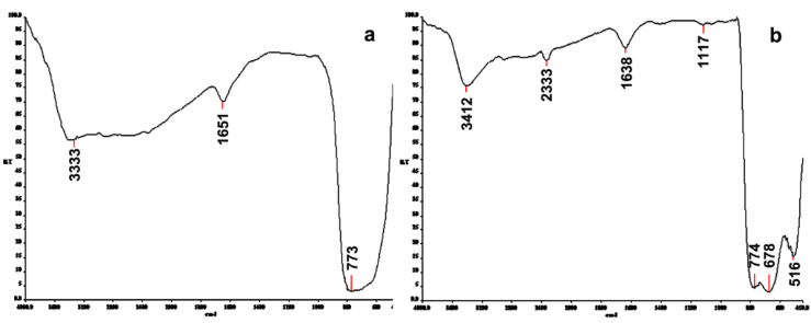 Fig. 3 Shows the FTIR spectra of bulk and nano TiO2 (reduced by Moraxella Osloensis) respectively. While peaks at 3333 cm-1, 1651 cm-1, 773 cm-1 (C-H rock of alkanes) can be seen in both bulk and nano TiO2, peaks at 2333 cm-1, 1117 cm-1 (C-N stretch of aliphatic amine), 678 cm-1 (N-H wag of 1° and 2° amines) and 516 cm-1 could be been only in TiO2. The peaks found in bulk TiO2 were comparable with the peaks for pure TiO2 obtained by Wan et al. [19] and Wu et al. [20]. A shift in peak wavelength from 3333 cm-1 to 3412 cm-1 was observed after reduction of bulk TiO2 to nano TiO2. This may be due to the overlapping of 3333 cm-1 with the N-H stretching vibrations of 1° and 2° amines and amides of bacterial proteins that are involved in the bio-reduction.