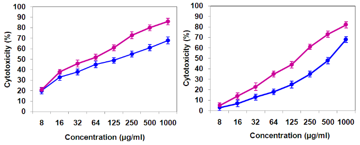 Fig. 4: Cytotoxicity analysis of Bulk TiO2 and TiO2 nanoparticles synthesized by Moraxella osloensis against (a) HaCat and (b) Hep2 cell lines